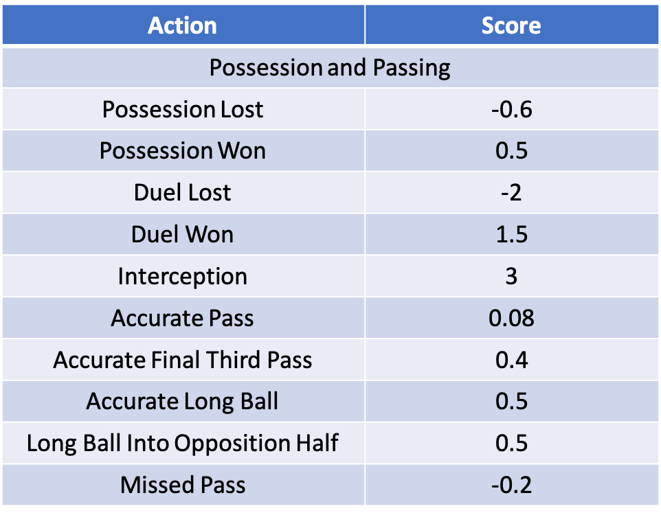 The all-around score awards positive and negative scores to players for their more minor actions throughout the game. There are a number of statistics in categories covering possession, attacking, defending, goalkeeping and a general category. The point weighting for each statistic varies by position.