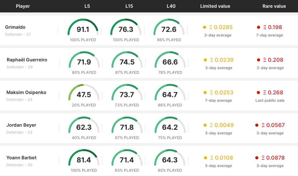 Finally, let’s take a look over the top 10 ranked defenders on Soraredata based on their L15 average and see how they earn their scores. We have a few questions to answer to help inform our defender selections;