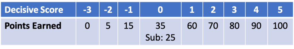Players start with a Decisive Score of 0, and so earn 35 points or 25 if they are a substitute. Each positive decisive action adds one to the score and each negative decisive action takes on away from the score.