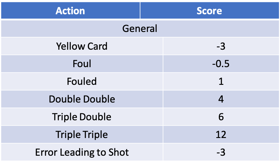 Looking at the rest of the general category, there are some pretty decent negatives for yellow cards and errors leading to shots. There’s also a small half-point penalty committing foul, but a whole point reward for drawing a foul.