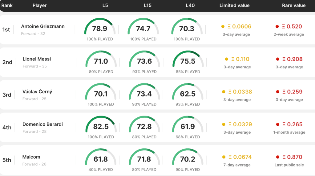 The main use for your Sorare cards is to play them in SO5 competitions. In these competitions you select 5 players to score points for you and compete against other managers to earn NFT cards and Etherium. To win card rewards we will typically need to hit 350 points in regular competitions or 425+ in the amateur draft competitions – so we need to be choosing players that can score in the 70-80 range and have the potential for a perfect 100 score.