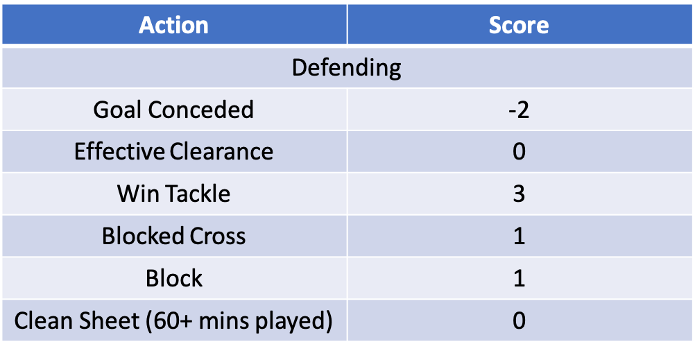 In the defending category we can see midfielders have a less points to earn than defenders. In particular, they can’t earn any points for a clean sheet, although they do lose less points for goals conceded as a result.