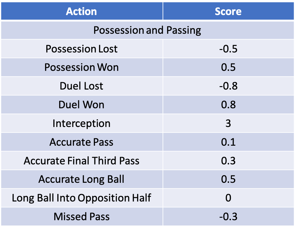 The all-around score awards positive and negative scores to players for their more minor actions throughout the game. There are a number of statistics in categories covering possession, attacking, defending, goalkeeping and a general category. The point weighting for each statistic varies by position.