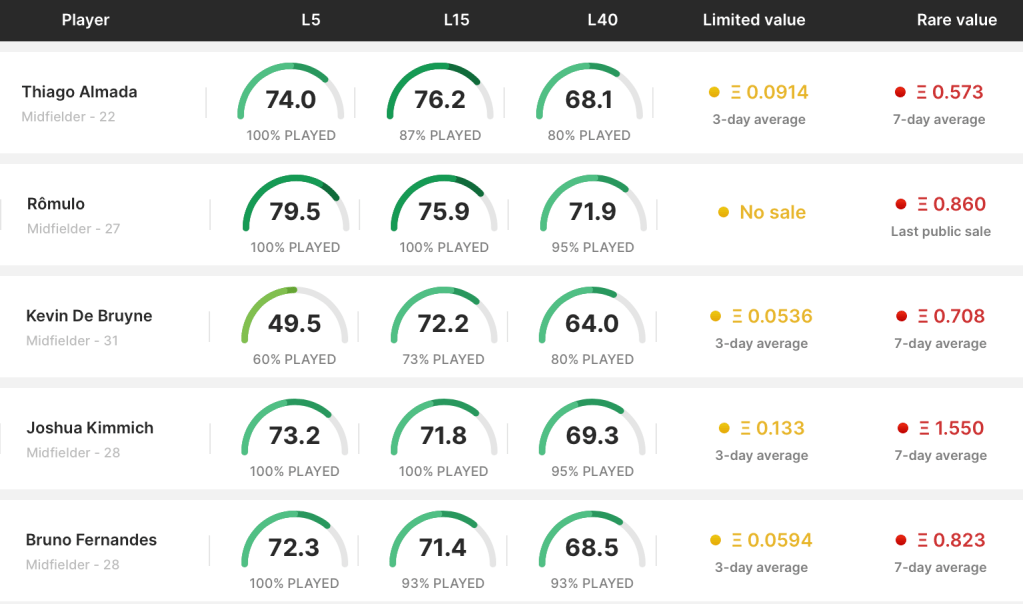 The Sorare scoring matrix can be a bit of black hole to new players, so across a couple of articles I’m going to run you through how the scoring matrix works and how it influences which players to use in your line-ups. This article focuses on midfielder scoring, you can find scoring for the other positions here.